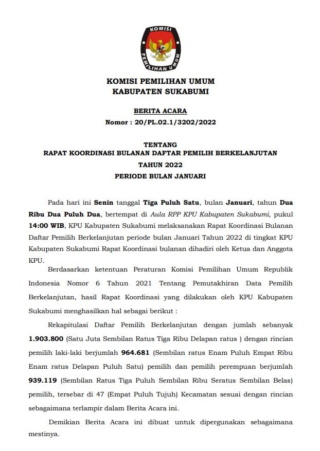 Pengumuman Daftar Pemilih Berkelanjutan Periode Januari Tahun 2022 Senin, 31 Januari 2022 00:00 50 Selengkapnya BA dapat diunduh Disini Bagikan: Dilihat 50 Kali.