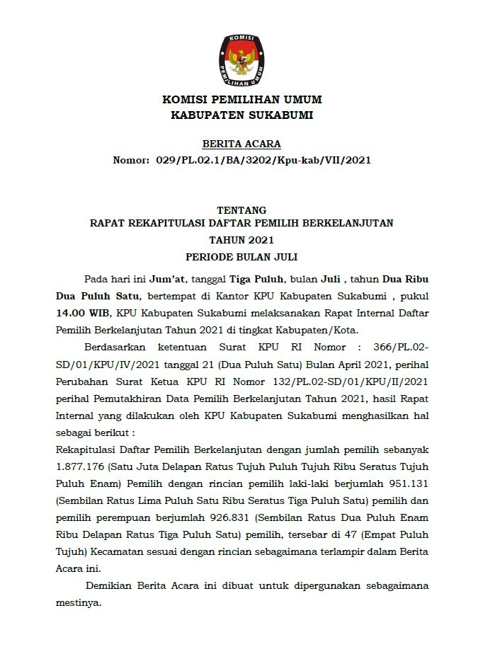 Pengumuman Daftar Pemilih Berkelanjutan Periode Juli Tahun 2021 Jumat, 30 Juli 2021 00:00 352 Selengkapnya BA dapat diunduh Disini Bagikan: Dilihat 352 Kali.