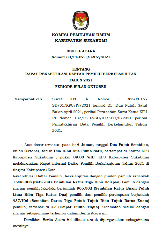 Pengumuman Daftar Pemilih Berkelanjutan Periode Oktober Tahun 2021 Jumat, 29 Oktober 2021 00:00 42 Selengkapnya BA dapat diunduh Disini Bagikan: Dilihat 42 Kali.