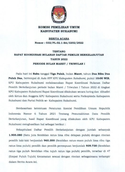 Pengumuman Daftar Pemilih Berkelanjutan Triwulan I Tahun 2022 Rabu, 30 Maret 2022 00:00 60 Selanjutnya BA dapat diunduh Disini Bagikan: Dilihat 60 Kali.