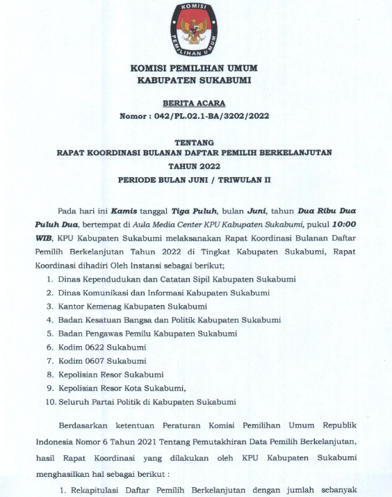 Pengumuman Daftar Pemilih Berkelanjutan Triwulan II Tahun 2022 Kamis, 30 Juni 2022 07:00 98 Selengkapnya BA dapat diunduh Disini Bagikan: Dilihat 98 Kali.