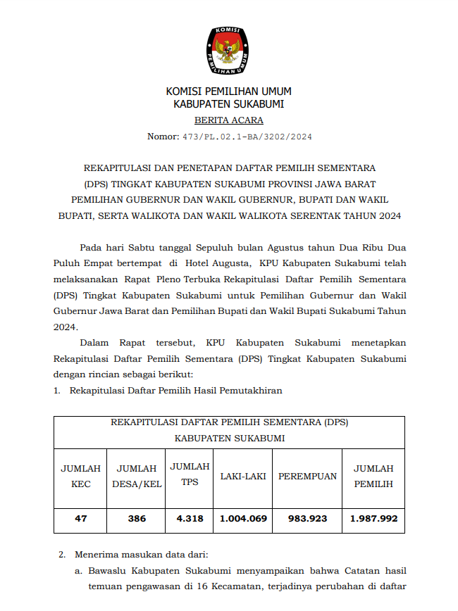 REKAPITULASI DAN PENETAPAN DAFTAR PEMILIH SEMENTARA (DPS) TINGKAT KABUPATEN SUKABUMI PROVINSI JAWA BARAT PEMILIHAN GUBERNUR DAN WAKIL GUBERNUR, BUPATI DAN WAKIL BUPATI, SERTA WALIKOTA DAN WAKIL WALIKOTA SERENTAK TAHUN 2024.