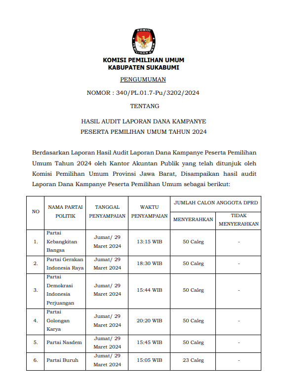 Berikut kami sampaikan Pengumuman Hasil Audit Dana Kampanye Peserta Pemilu Tahun 2024 tingkat Kabupaten Sukabumi.