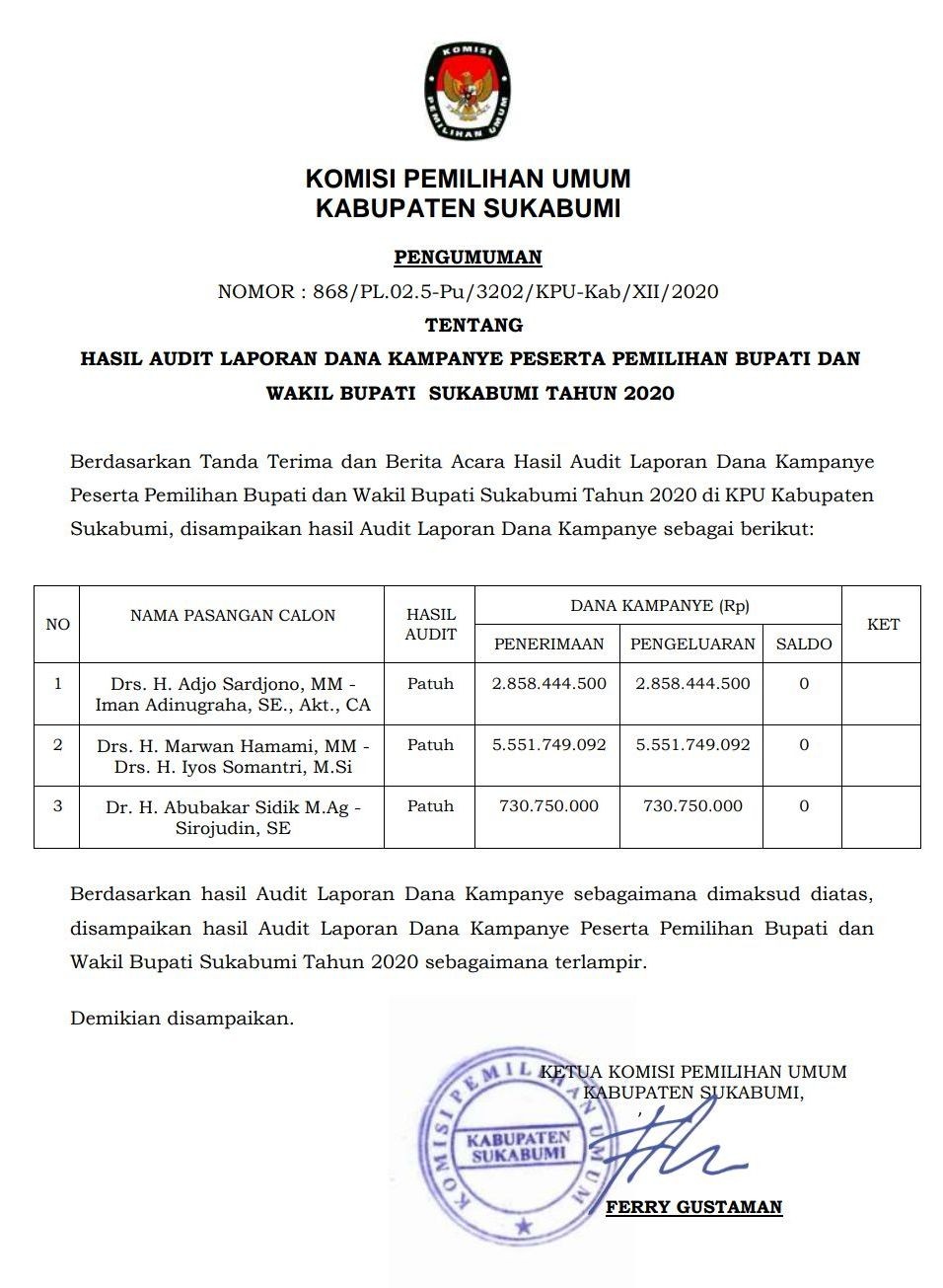 PENGUMUMAN HASIL AUDIT LAPORAN DANA KAMPANYE PESERTA PEMILIHAN BUPATI DAN WAKIL BUPATI SUKABUMI TAHUN 2020