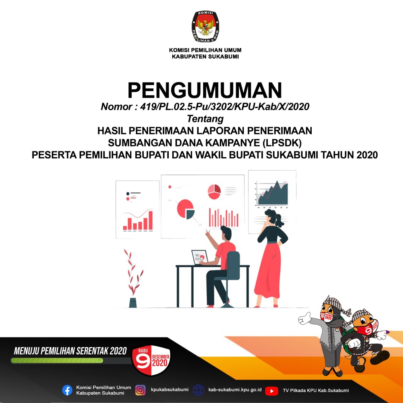 Bersama ini kami sampaikan Pengumuman Laporan Penerimaan Sumbangan Dana Kampanye (LPSDK) Peserta Pemilihan Bupati dan Wakil Bupati Sukabumi Tahun 2020, pengumuman selengkapnya dapat diunduh disini