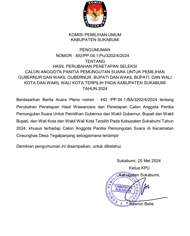 PENGUMUMAN NOMOR : 492/PP.04.1-Pu/3202/4/2024 TENTANG HASIL PERUBAHAN PENETAPAN SELEKSI CALON ANGGOTA PANITIA PEMUNGUTAN SUARA UNTUK PEMILIHAN GUBERNUR DAN WAKIL GUBERNUR, BUPATI DAN WAKIL BUPATI, DAN WALI KOTA DAN WAKIL WALI KOTA TERPILIH PADA KABUPATEN SUKABUMI TAHUN 2024.