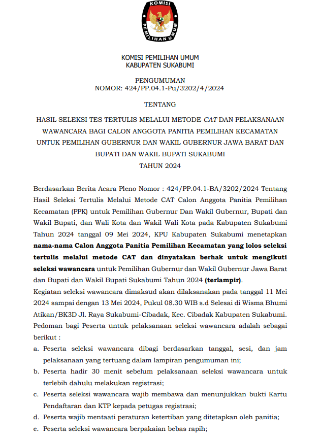PENGUMUMAN NOMOR: 424/PP.04.1-Pu/3202/4/2024 TENTANG HASIL SELEKSI TES TERTULIS MELALUI METODE CAT DAN PELAKSANAAN WAWANCARA BAGI CALON ANGGOTA PANITIA PEMILIHAN KECAMATAN UNTUK PEMILIHAN GUBERNUR DAN WAKIL GUBERNUR JAWA BARAT DAN BUPATI DAN WAKIL BUPATI SUKABUMI TAHUN 2024.