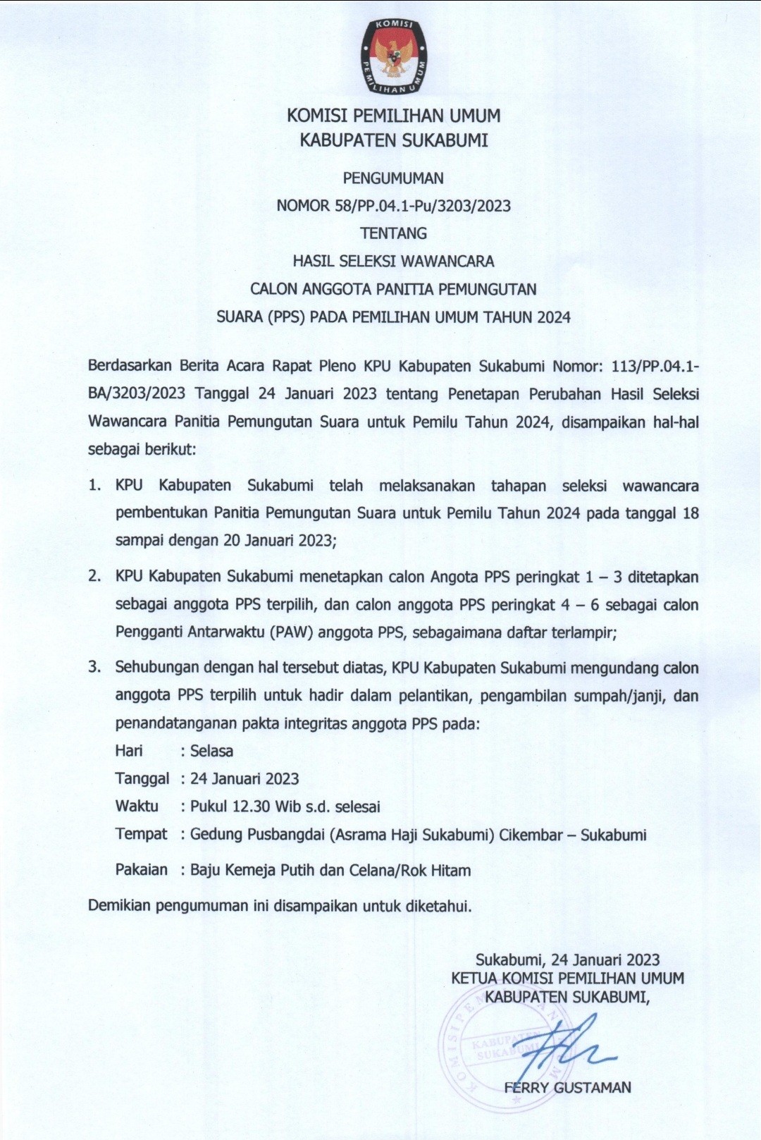 Pengumuman Hasil Seleksi Wawancara Calon Anggota PPS untuk Pemilihan Umum Tahun 2024