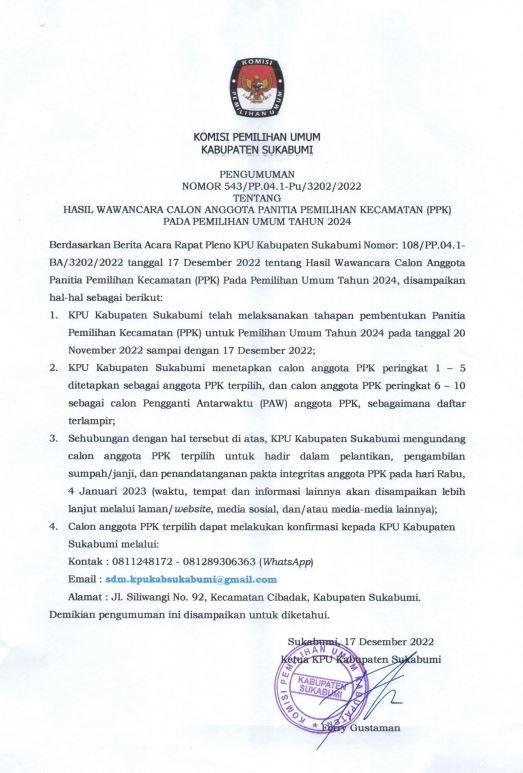PENGUMUMAN HASIL WAWANCARA CALON ANGGOTA PANITIA PEMILIHAN KECAMATAN (PPK) PADA PEMILIHAN UMUM TAHUN 2024