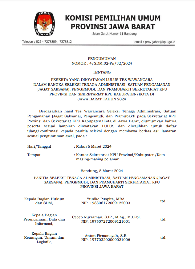 PENGUMUMAN LULUS TES WAWANCARA SELEKSI TENAGA ADMINISTRASI, JAGAT SAKSANA, PENGEMUDI, DAN PRAMUBAKTI SEKRETARIAT KPU KABUPATEN SUKABUMI
