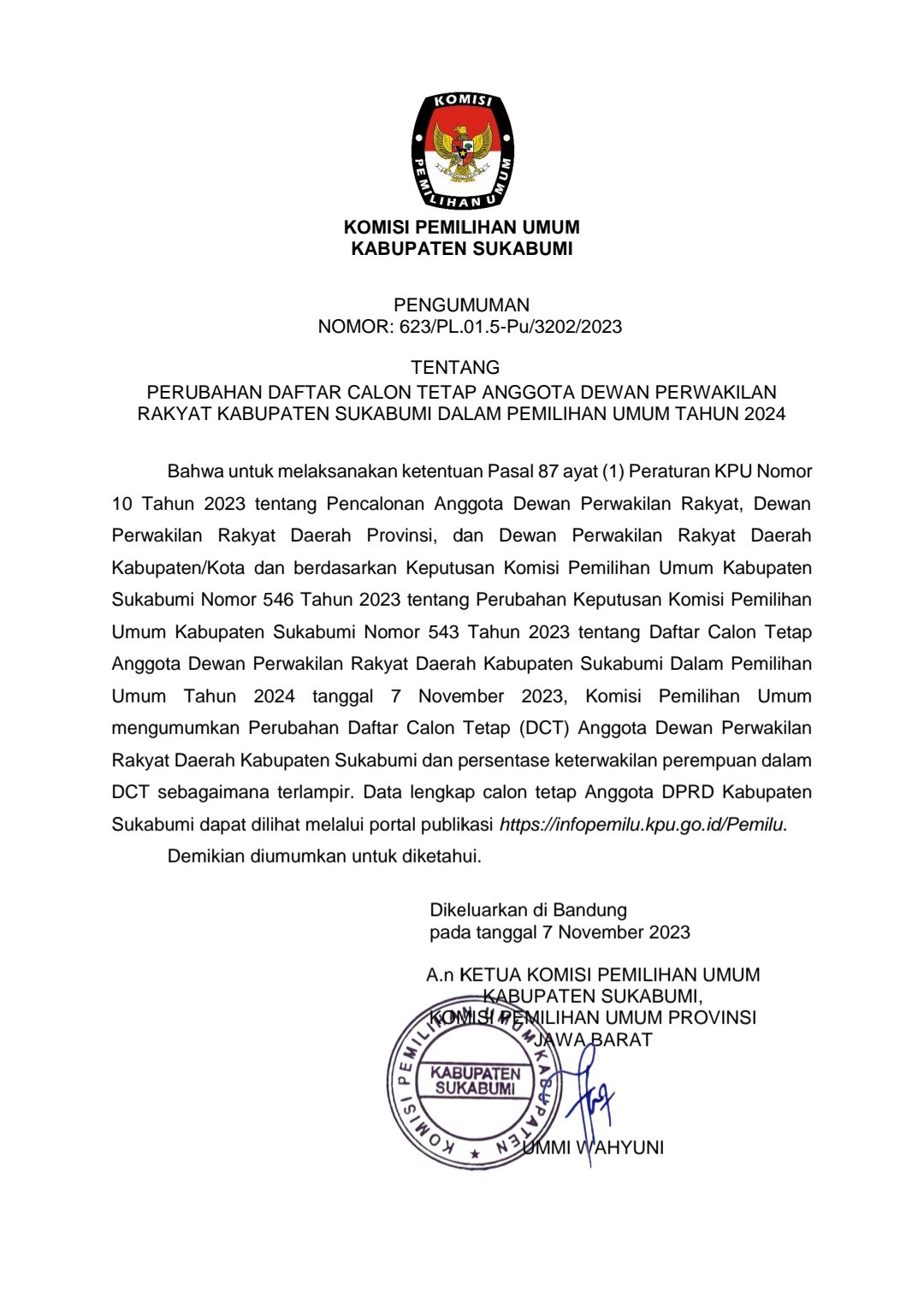 Pengumuman tentang Perubahan Daftar Calon Tetap Anggota DPRD Kabupaten Sukabumi dalam Pemilihan Umum Tahun 2024.