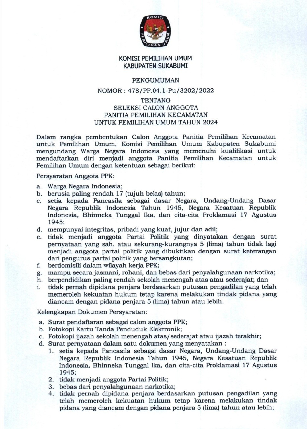 Pengumuman Pendaftaran Anggota PPK Pemilu 2024 Minggu, 20 November 2022 07:00 294 Selengkapnya surat pengumuman dapat di unduh disini Bagikan: Dilihat 294 Kali.