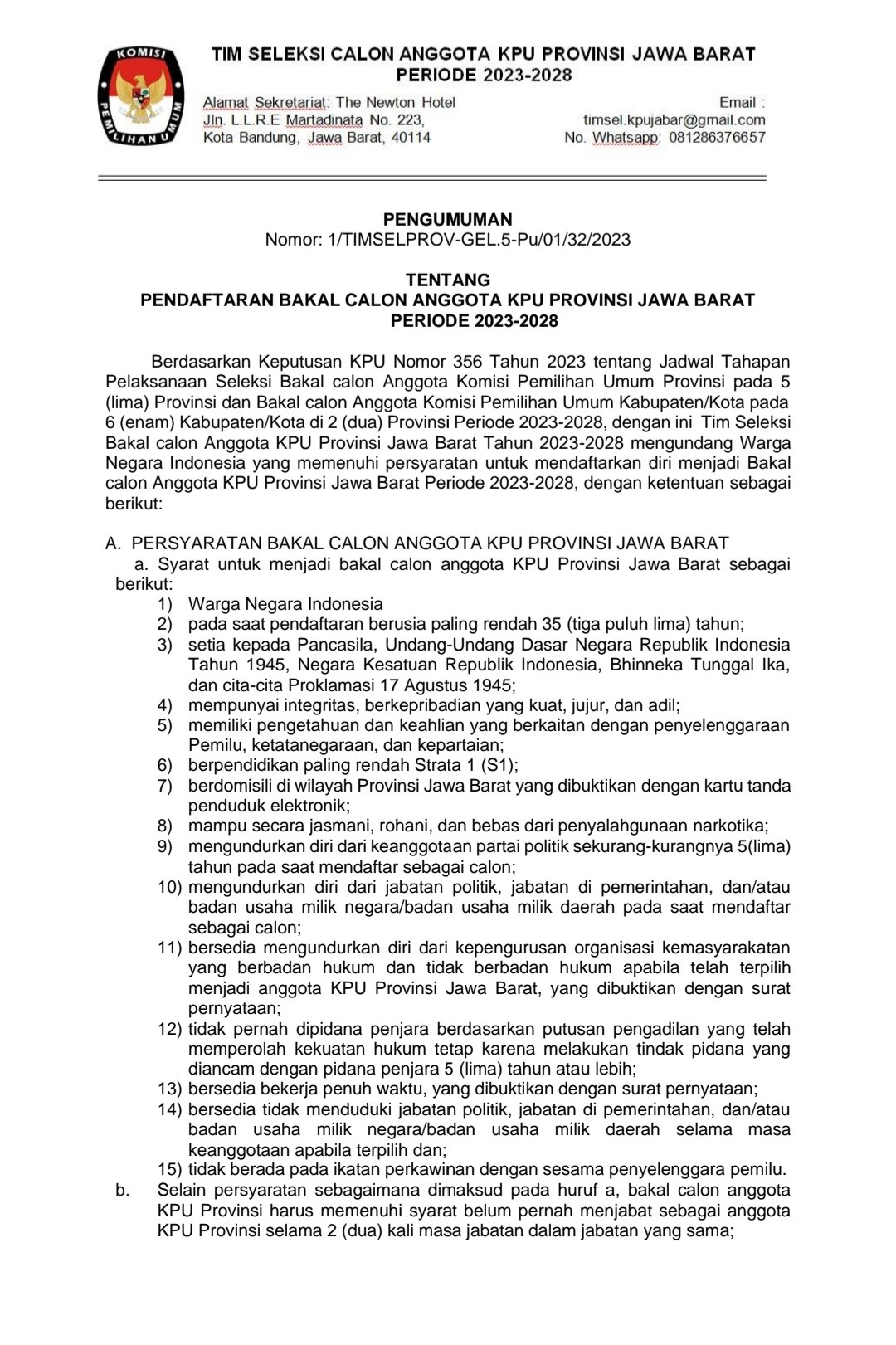 Pengumuman Pendaftaran Bakal Calon Anggota KPU Provinsi Jawa Barat Periode 2023-2028 Senin, 15 Mei 2023 00:00 255 Selengkapnya Pengumuman dapat diunduh DISINI Bagikan: Dilihat 255 Kali.