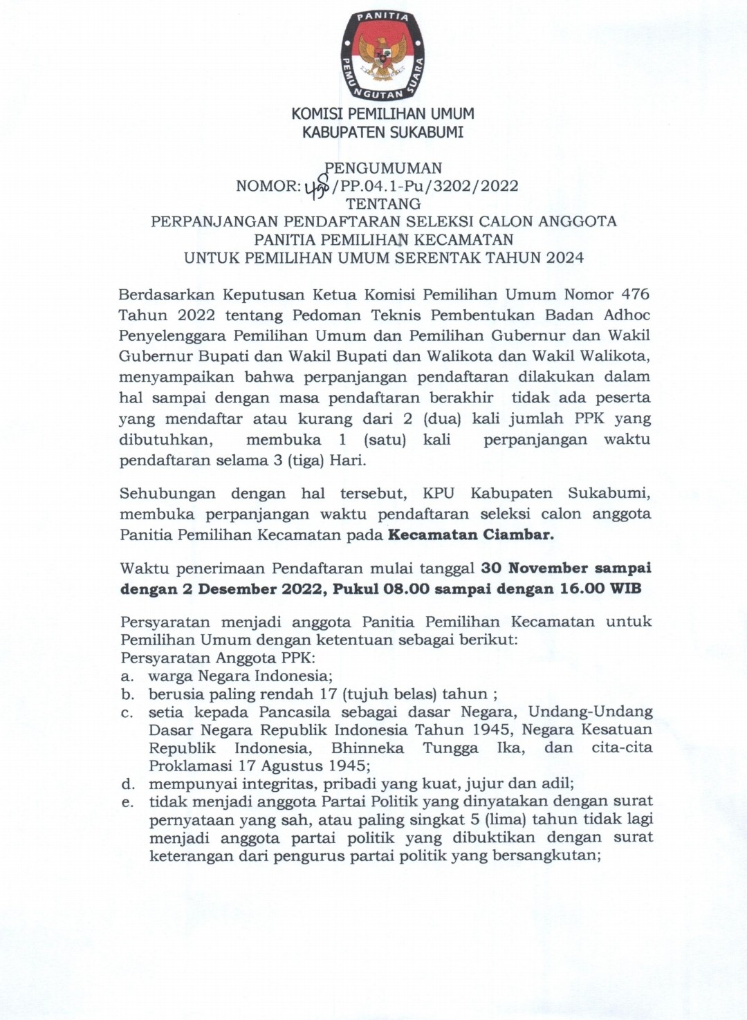 Pengumuman Perpanjangan Pendaftaran PPK Pemilu 2024 Kecamatan Ciambar Rabu, 30 November 2022 07:00 294 Berikut kami sampaikan pengumuman perpanjangan pendaftaran PPK khusus untuk Kecamatan Ciambar untuk pemilu 2024. Selanjutnya pengumuman dapat diunduh disni dan Berita Acara dapat diunduh disini Bagikan: Dilihat 294 Kali.