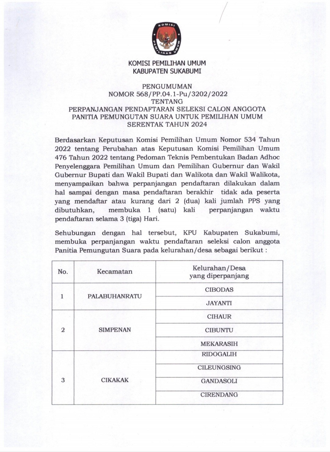 Pengumuman Perpanjangan Pendaftaran Seleksi Calon Anggota PPS untuk Pemilu 2024 Sabtu, 31 Desember 2022 08:25 804 Untuk selengkapnya pengumuman dapat diunduh DISINI Bagikan: Dilihat 804 Kali.