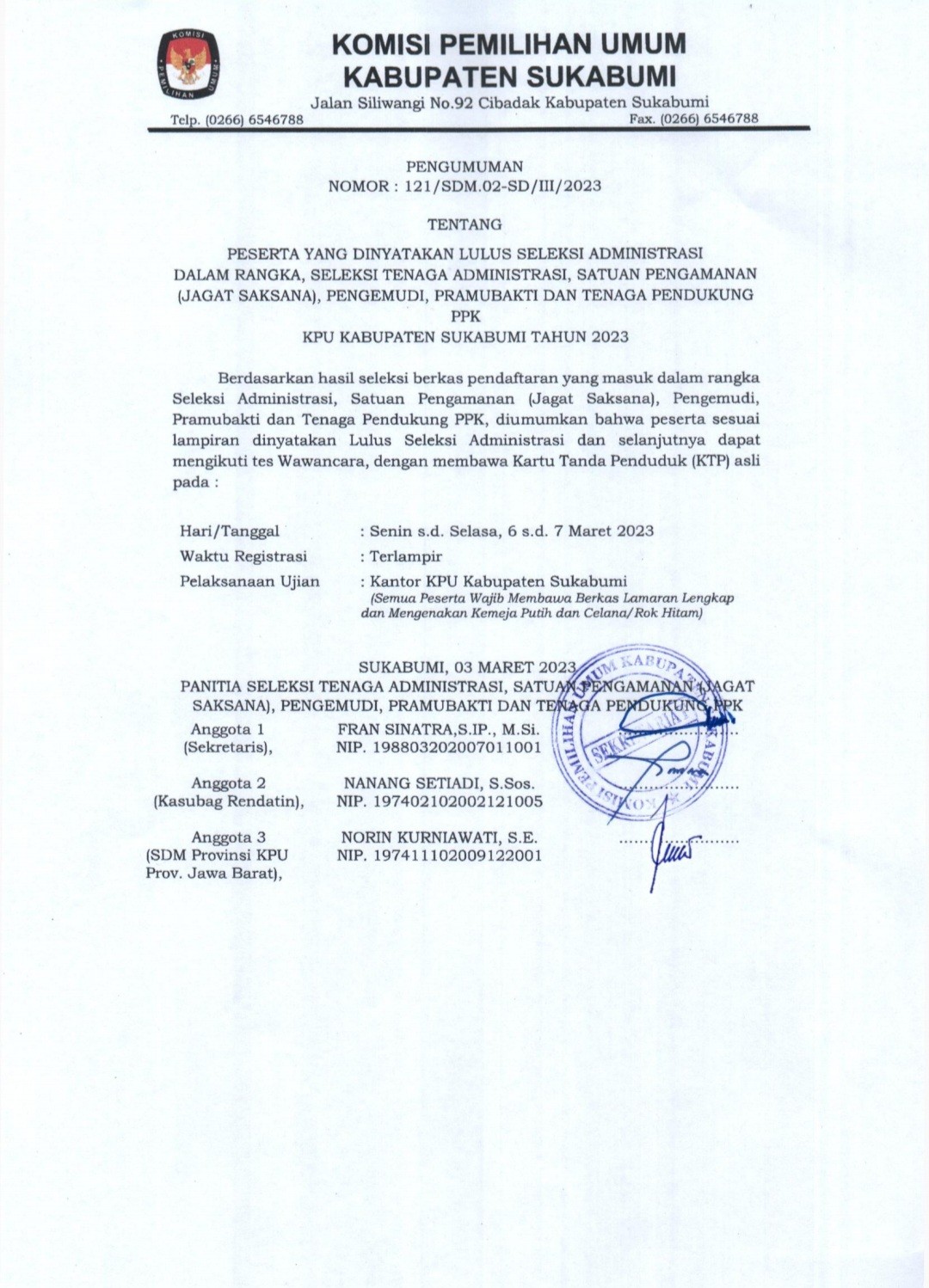 Pengumuman peserta lulus seleksi Administrasi Jumat, 03 Maret 2023 19:05 381 Selengkapnya Pengumuman dan Jadual Wawancara dapat diunduh disini Bagikan: Dilihat 381 Kali.