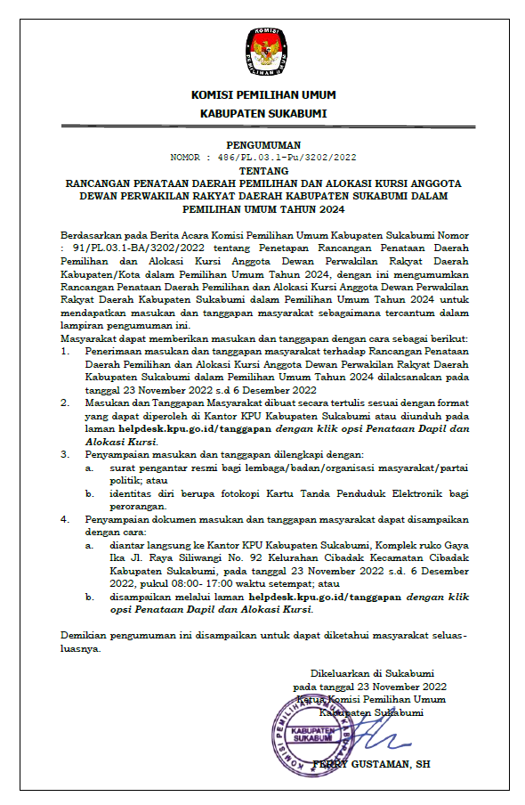 Pengumuman Rancangan Penataan Daerah Pemilihan Dan Alokasi Kursi Kabupaten Sukabumi untuk Pemilu 2024 Rabu, 23 November 2022 07:00 424 Untuk selengkapnya dokumen dapat diunduh Disini Bagikan: Dilihat 424 Kali.