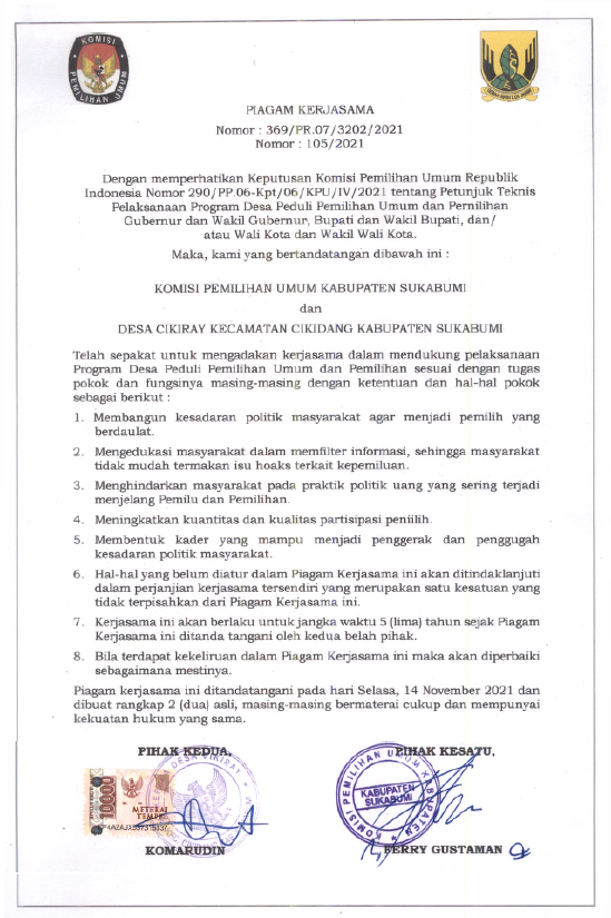 PERJANJIAN KERJASAMA ANTARA KPU KABUPATEN SUKABUMI DAN DESA CIKIRAY KECAMATAN CIKIDANG KABUPATEN SUKABUMI TENTANG PELAKSANAAN PROGRAM DESA PEDULI PEMILU DAN PEMILIHAN Rabu, 15 Desember 2021 00:00 433 Selengkapnya perjanjian kerjasama dapat diunduh Disini Bagikan: Dilihat 433 Kali.