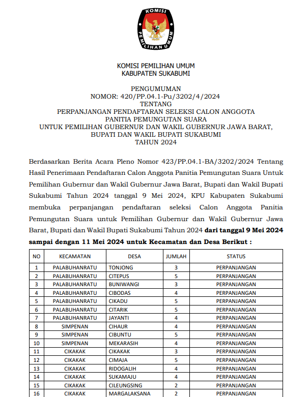 BERIKUT KAMI SAMPAIKAN PENGUMUMAN NOMOR: 420/PP.04.1-Pu/3202/4/2024 TENTANG PERPANJANGAN PENDAFTARAN SELEKSI CALON ANGGOTA PANITIA PEMUNGUTAN SUARA UNTUK PEMILIHAN GUBERNUR DAN WAKIL GUBERNUR JAWA BARAT, BUPATI DAN WAKIL BUPATI SUKABUMI TAHUN 2024.