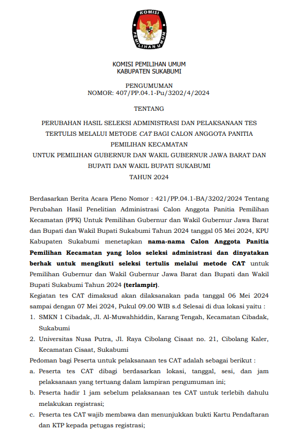 Berdasarkan Berita Acara Pleno Nomor : 421/PP.04.1-BA/3202/2024 Tentang Perubahan Hasil Penelitian Administrasi Calon Anggota Panitia Pemilihan Kecamatan (PPK) Untuk Pemilihan Gubernur dan Wakil Gubernur Jawa Barat dan Bupati dan Wakil Bupati Sukabumi Tahun 2024 tanggal 05 Mei 2024, KPU Kabupaten Sukabumi menetapkan nama-nama Calon Anggota Panitia Pemilihan Kecamatan yang lolos seleksi administrasi dan dinyatakan berhak untuk mengikuti seleksi tertulis melalui metode CAT untuk Pemilihan Gubernur dan Wakil Gubernur Jawa Barat dan Bupati dan Wakil Bupati Sukabumi Tahun 2024.