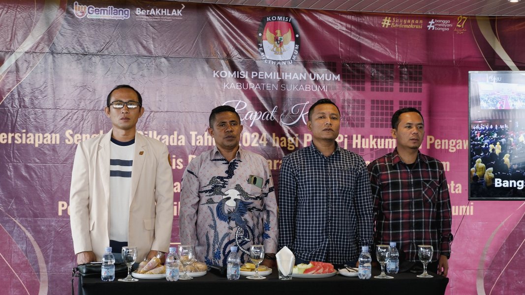 Pelaksanaan Kegiatan Rapat Kerja Pelaksanaan Sengketa Pilkada Tahun 2024 bagi PPK Pj Hukum dan Pengawasan serta PPK Pj Teknis Penyelenggaraan di 27 Kecamatan dalam wilayah Kabupaten Sukabumi yang menjadi locus sengketa perselisihan hasil pemilihan Bupati dan Wakil Bupati Sukabumi dihadiri oleh Ketua dan Anggota KPU Kabupaten Sukabumi, Sekretaris KPU Kabupaten Sukabumi, Para Kepala Sub Bagian dan Staf Teknis Penyelenggaraan Pemilu dan Hukum Sekretariat KPU Kabupaten Sukabumi serta Narasumber.