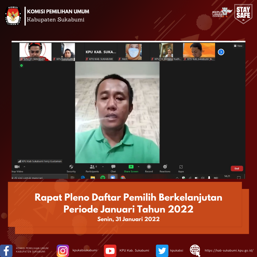 Sukabumi, kab-sukabumi.kpu.go.id - KPU Kabupaten Sukabumi menggelar Rapat Pleno Daftar Pemilih Berkelanjutan (DPB) periode Januari Tahun 2022 secara secara daring menggunakan Aplikasi Zoom Meeting, Senin (31/01/2022).