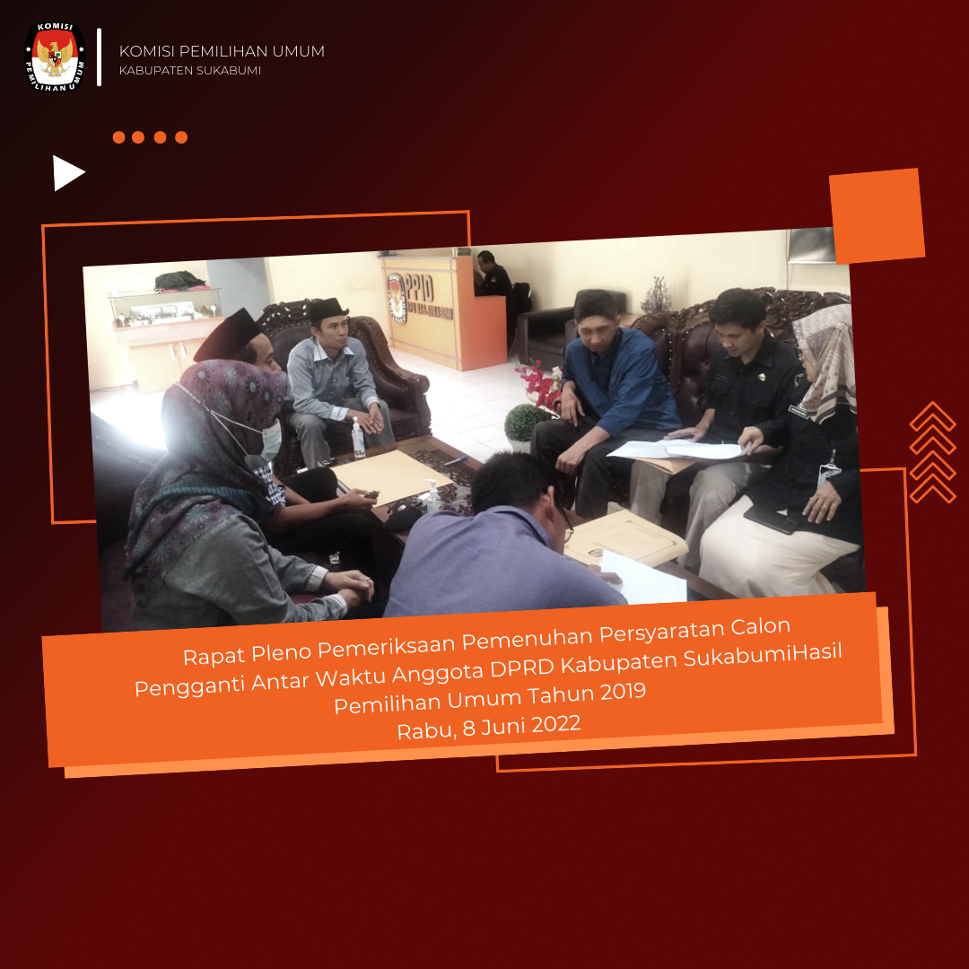 Hasil dari verifikasi tersebut, KPU Kabupaten Sukabumi melaksanakan Rapat Pleno Pemeriksaan Pemenuhan Persyaratan Calon Pengganti Antar Waktu Anggota DPRD Kabupaten Sukabumi Hasil Pemilihan Tahun 2019. Bertempat di ruang rapat KPU Kabupaten Sukabumi, dengan dihadiri oleh Ketua dan Anggota KPU Kabupaten Sukabumi dan Seluruh Kasubag KPU Kabupaten Sukabumi, Rabu (8/06/2022).