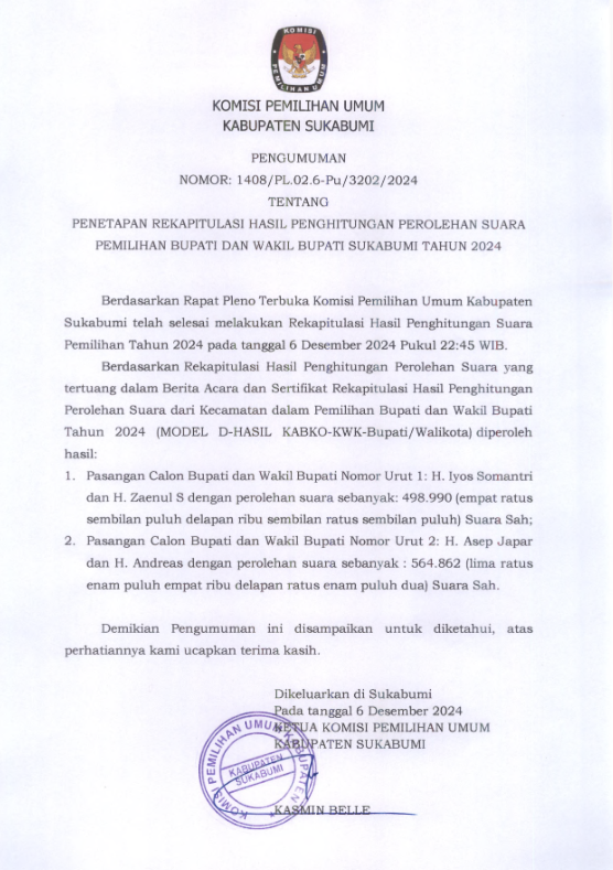 Sukabumi, 6 Desember 2024 – Komisi Pemilihan Umum (KPU) Kabupaten Sukabumi mengumumkan hasil rekapitulasi perhitungan suara Pemilihan Bupati dan Wakil Bupati Sukabumi Tahun 2024 setelah melalui proses yang teliti dan akurat. Hasil ini berdasarkan perhitungan suara yang telah diterima dari seluruh PPK (Panitia Pemilihan Kecamatan) di wilayah Kabupaten Sukabumi.