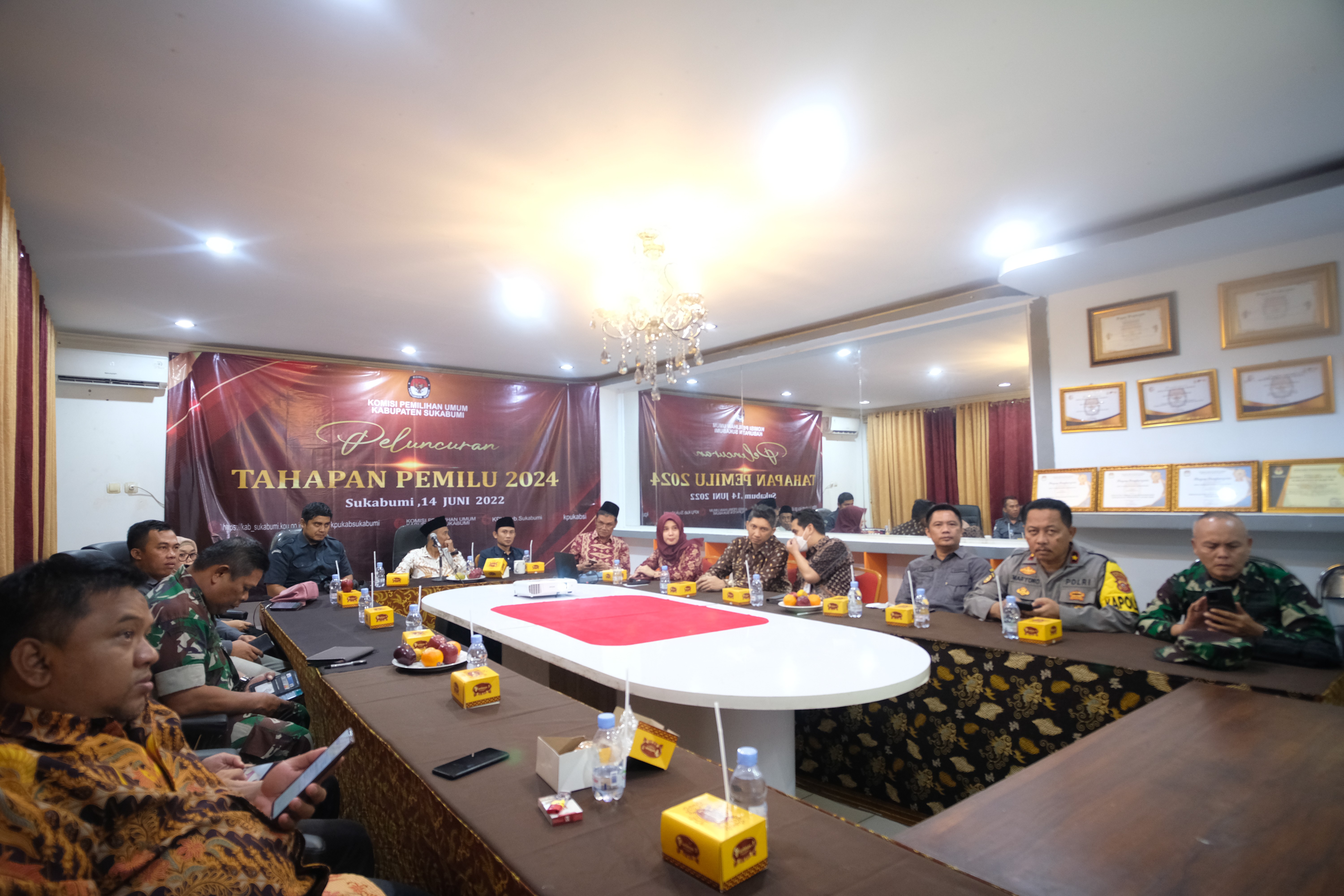 Cibadak- Ketua KPU Kabupaten Sukabumi Ferry Gustaman, Anggota KPU Meri Sariningsih, H. Ayi Saepudin, Budi Ardiasnyah, Hamdan Sapari, Sekretaris KPU Kabupaten Sukabumi Fran Sinatra beserta jajaran mengikuti kegiatan nonton bersama peluncuran tahapan pemilu 2024 yang diselenggarakan oleh KPU RI secara daring dan luring (14/06).