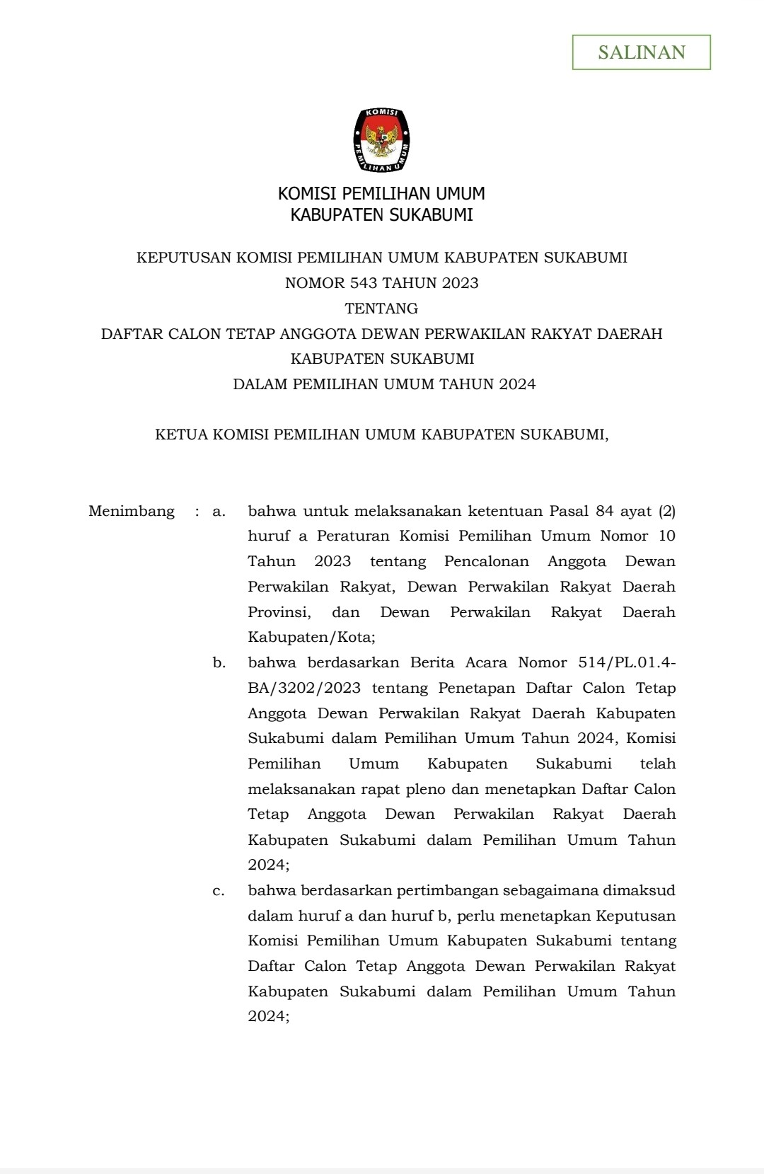 Salinan Surat Keputusan Daftar Calon Tetap Anggota DPRD Kabupaten Sukabumi Pemilihan Umum Tahun 2024