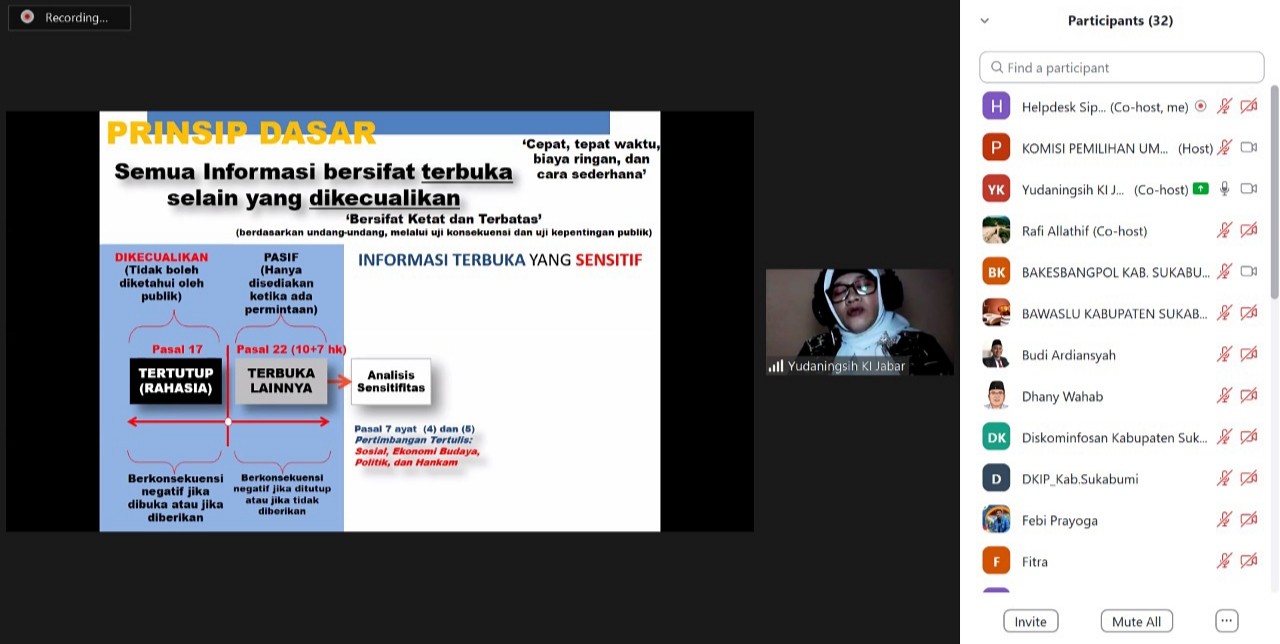 Materi kedua disampaikan oleh Komisioner Komisi Informasi Provinsi Jawa Barat Yudaningsih, S.Ag., M.Si., Med dengan judul Keterbukaan Informasi Publik yang Berintegritas dan Akuntabel. Fokus materi pembahasan narasumber kedua ini yaitu sesuai dengan judul materi yang berfokus pada keterbukaan informasi publik, juga membahas mengenai potensi sengketa informasi publik.