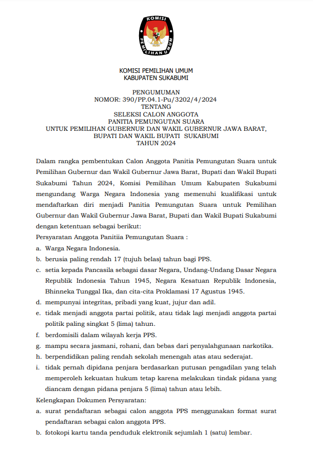 PENGUMUMAN NOMOR: 390/PP.04.1-Pu/3202/4/2024 TENTANG SELEKSI CALON ANGGOTA PANITIA PEMUNGUTAN SUARA UNTUK PEMILIHAN GUBERNUR DAN WAKIL GUBERNUR JAWA BARAT, BUPATI DAN WAKIL BUPATI SUKABUMI TAHUN 2024.