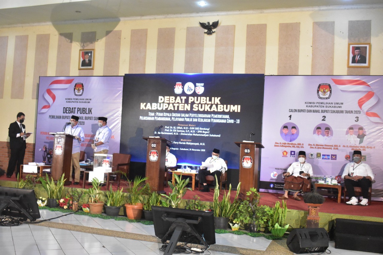 Tiga pasangan calon (paslon) Bupati dan Wakil Bupati yang akan maju dalam Pemilihan Kepala Daerah (Pilkada) Kabupaten Sukabumi, beradu program dalam debat publik yang digelar oleh Komisi Pemilihan Umum (KPU) setempat, Selasa (24/11/2020).Bertempat di salah satu Hotel di Jalan Cikukulu Kecamatan Cicantayan, Kabupaten Sukabumi, debat publik tersebut dimulai pukul 14.00 WIB sampai pukul 16.00 WIB, dengan jumlah peserta dibatasi.